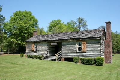 | A restored 19th century log home stands across the parking lot from the visitor center. |