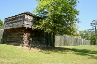 | The 1813 stockade has been reconstructed at Fort Mitchell. Archaeological excavations were used to pinpoint details on the design of the fort. |