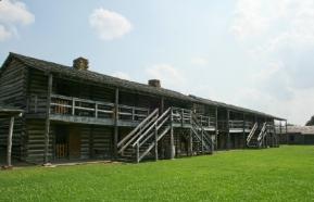 | Two-story blockhouses like this one were built on two diagonal angles of the original stockade. They projected slightly beyond the stockade line of the fort, so that marksmen could easily fire on attackers. |