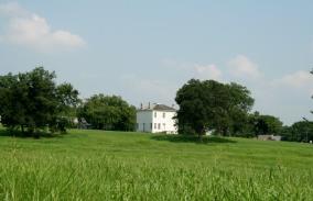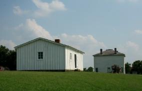 | The bakery (left) and hospital (right) of the second post can be seen atop Garrison Hill at Fort Gibson Historic Site. |