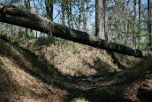 A fallen tree bridges a section
