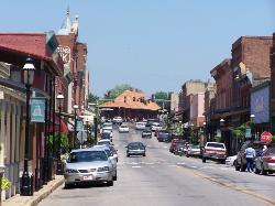 | The historic Crawford County Courthouse, still standing in Van Buren, looks out on the scene of the rush to the river. Severely damaged by fire in later years, the structure is a beloved part of Van Buren. |