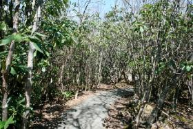 Paved Path leading through Rhododendron.