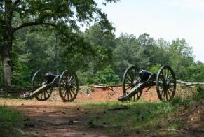 Confederate cannon aim out from Civil War earthworks in the Cheatham Hill area of the Kennesaw Mountain Battlefield. |